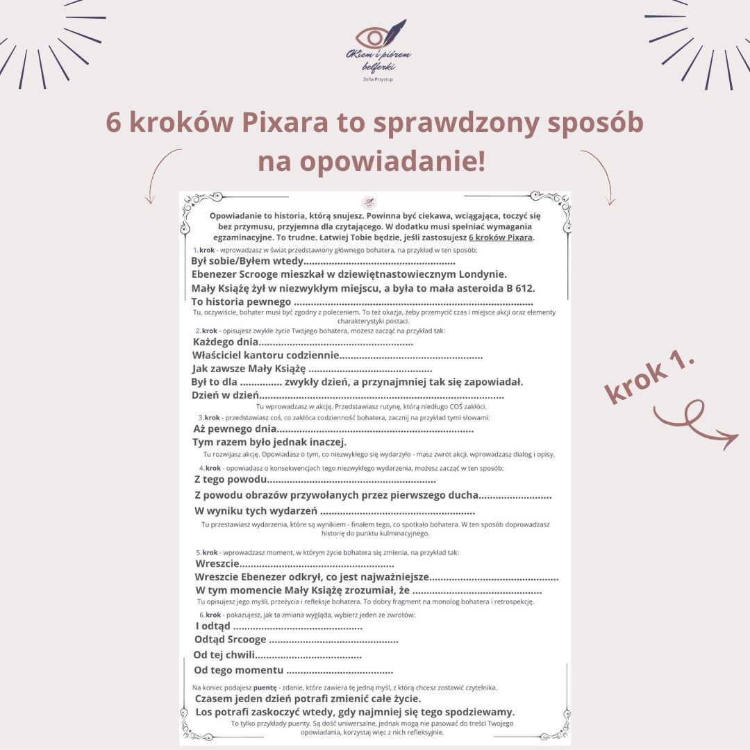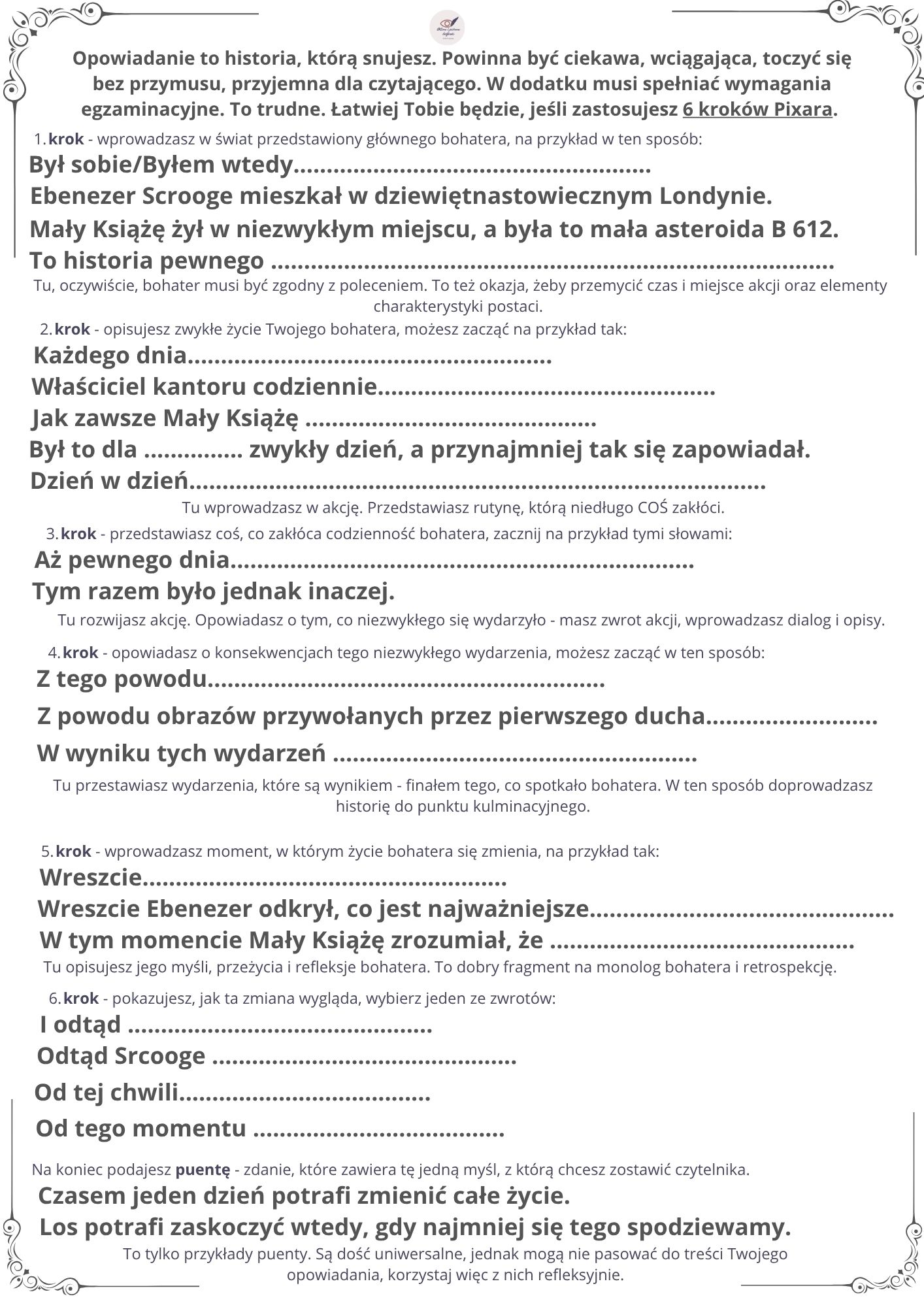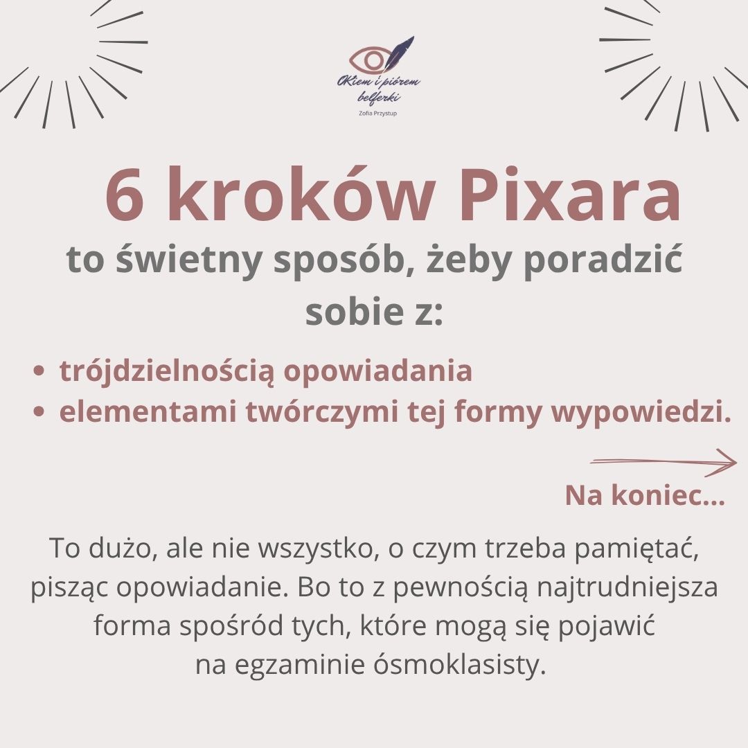 Jeśli już, jeśli koniecznie, jeśli temat rozprawki czy przemówienia zupełnie NIE, no to ok, można rzucić się na opowiadanie. W ramach tej desperacji zastosuj 6 kroków Pixara. Sprawdzone – sukces, splendor i majątek sprowadziły na autorów, więc…