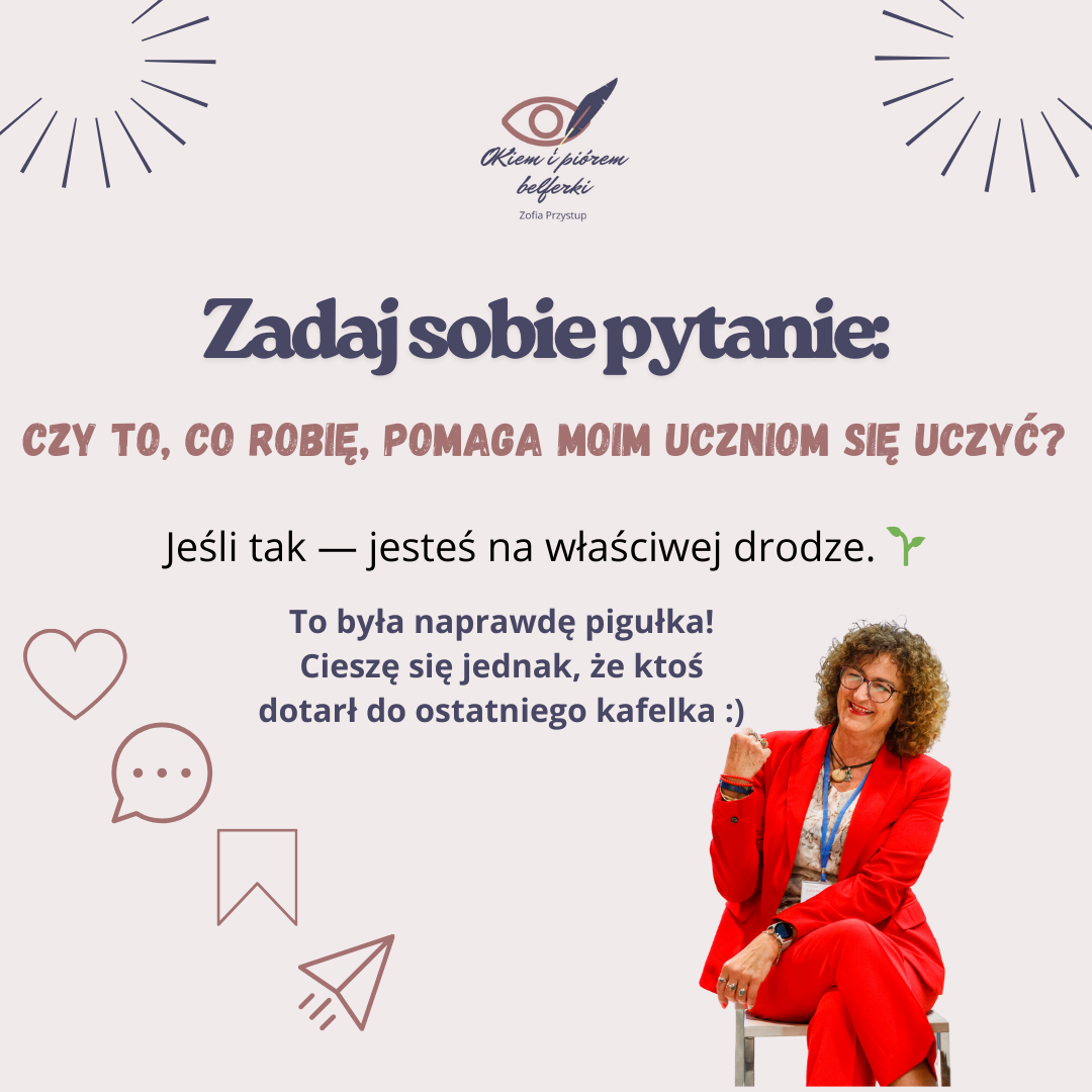 Owszem, mogłam podać notatkę🤷♀️ . Mogłam też tworzyć ją na zasadzie – kto wie, niech poda, napiszemy w zeszycie 🙈. Wszyscy to samo. Na pewno byłoby szybciej. I na pewno w większości bezmyślnie.